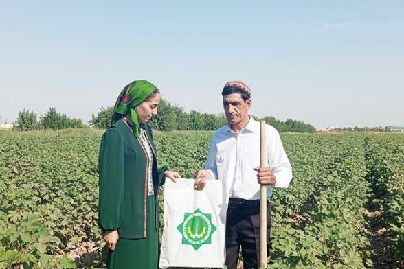 SURATDA: TAP-nyň Mary etrap komitetiniň hünärmeni Laçyn Ataýewanyň telekeçi daýhan Atamyrat Alyýewe sowgat gowşurýan pursady.
