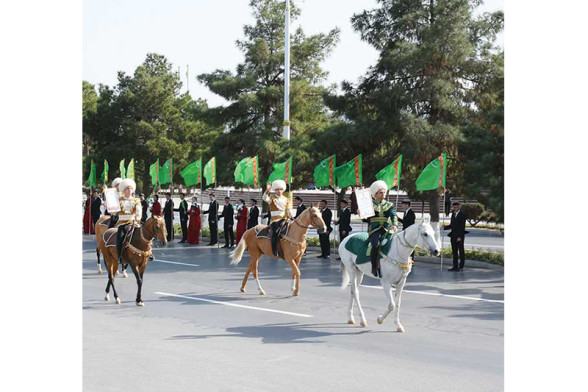 Binanyň öňündäki toý meýdançasy dabaraly toýa mahsus derejede bezelipdir. Milli şaý-sepleriň, at esbaplarynyň, amaly-haşam, nakgaşçylyk we şekillendiriş sungatyna degişli saýlanan eserleriň giň sergisi görenleri haýran galdyrdy. Bezelen binanyň tomaşa zalynda geçirilen dabaralar toý şowhunyna baýramçylyk öwüşginini çaýdy. Ýüreklere ýakyn çykyşlarda “Galkynyş” milli at üstündäki oýunlar toparynyň halkara derejesindäki gazanýan üstünlikleri dogrusynda täsirli gürrüňler edilip, ýurdumyzda atçylygy we atçylyk sportuny ösdürip, belende göterýän Gahryman Arkadagymyza, Arkadagly Gahryman Serdarymyza alkyş sözleri ýaňlandy.
