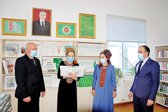 Mekdebiň müdiri Täzegül Ýazlyýewa, müdiriň okuw işleri baradaky orunbasary Yslam Işanow, informatika mugallymlary Kümüş Meredowa, Agaröwşen Halmyradow dagy hormatly Prezidentimiziň “Türkmenistanyň dermanlyk ösümlikleri” atly 12 jiltlik kitabyndan «Bathyz» döwlet tebigy goraghanasynda bar bolan dermanlyk otlar bilen tanşyp, yzygiderli pikir alyşýarlar.