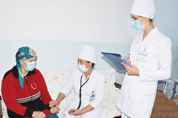 SURATDA: lukman Güljemile Amanowa bilen şepagat uýasy Zöhre Agajanowanyň näsagy barlap duran pursaty.