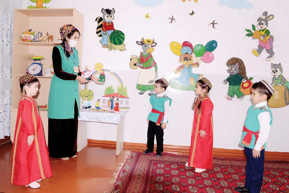 SURATDA: terbiýeçi Ogultäç Tokgaýewa körpeler bilen sapak wagtynda.