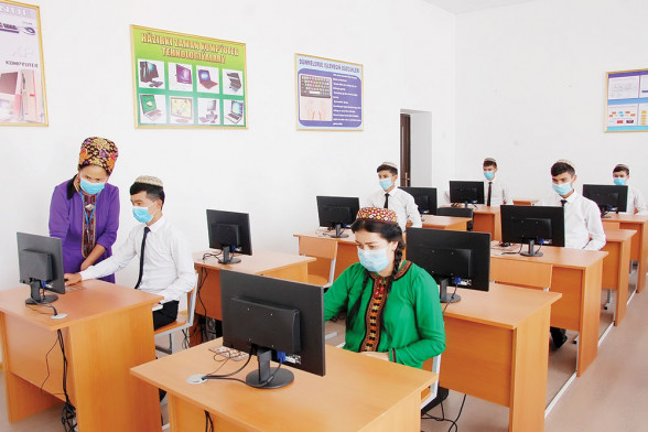 SURATLARDA: mekdebiň fizika-informatika mugallymy Ýazgül Hemraýewa, şeýle hem mekdebiň zähmet okuwy mugallymy Ogulşirin Hekimowa okuwçylar bilen sapak wagtynda.
