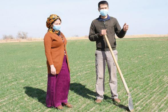 „SURATDA: kärendeçi Täzegül Soltanowa ýanýoldaşy Kakamyrat bilen ekin meýdanynda.