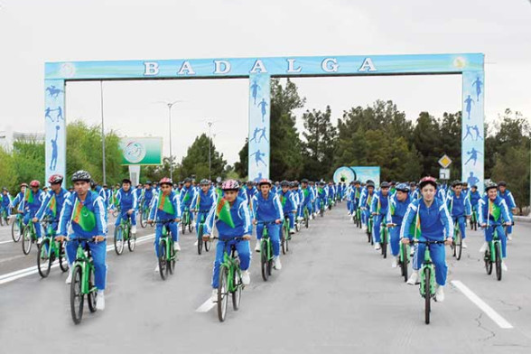 Bu ajaýyp senede däbimize öwrülen welosipedli ýöriş ir säher bilen Mary şäheriniň Kemine köçesinden badalga aldy. Uzak aralyga guralan ýörişiň dowamynda ajaýyp aýdym-sazlara, sport çykyşlaryna giň orun berildi. Şeýle täsirli çykyşlar welaýat taryhy we ülkäni öwreniş muzeýiniň, welaýat kitaphanasynyň, Marynyň Kemine adyndaky döwlet drama teatrynyň, Baş baýdak meýdançasynyň öňündäki meýdançalarda ýaýbaňlandyryldy. Gahryman Arkadagymyzyň, Arkadagly Gahryman Serdarymyzyň saýasynda alnyp barylýan beýik işleriň waspy ýaňlanan aýdymlaryň içinden eriş-argaç bolup geçdi. Ajaýyp owazlardyr tanslar bolsa welosipedli ýörişe gatnaşyjylara ruhy lezzet paýlady, olaryň baýramçylyk şowhunyny artdyrdy. Täsirli hem gyzgalaňly geçen ýöriş Beýik Saparmyrat Türkmenbaşy adyndaky welaýat medeniýet köşgüniň ýanynda tamamlandy.