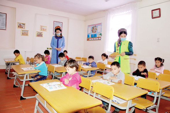 SURATDA: terbiýeçi Aýgül Berdiýewa terbiýeçiniň kömekçisi Gözel Saryýewa bilen sapak wagtynda.