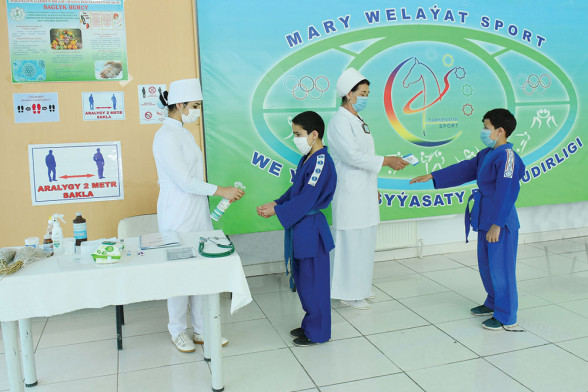 Mekdebiň lukmany Läle Meredowa, şepagat uýasy Gurbangül Gurbanowa tarapyndan türgenleriň beden gyzgynlygyny ölçemek, iki metr aralygy saklamak, hem-de olaryň ellerine zyýansyzlandyryjy serişdeleri sepmek işleri yzygiderli geçirilýär.